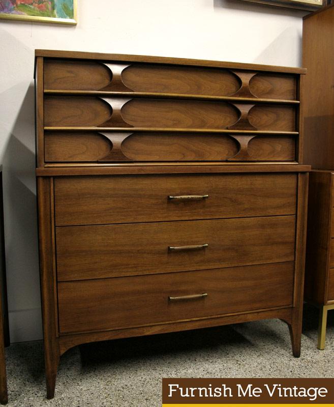 Super sexy retro 1950s / 1960s Kent Coffey Perspecta highboy tall dresser. One of the most collectible lines of the era, and it’s easy to see why. Signature sculpted inverted rosewood arch accents with fluted surfaces, this piece stands out among American Mid Century Modern design. Made with walnut, pecan and rosewood. We have a matching triple dresser, nightstand, and mirror (sold separately).
