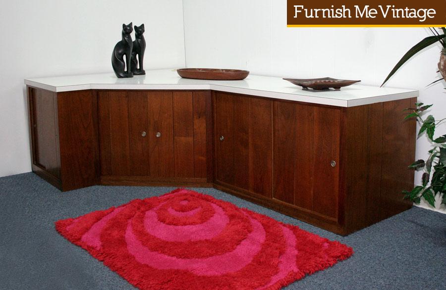 This “L” shaped cabinet / cocktail table combination features ample storage below the white laminate counter top. Wooden sliding doors give easy access to the cabinets which feature one vertically centered shelf. The backside is open, ideal for housing electronics and consoles for a home entertainment center. There is also an electrical outlet on the top of the table. The short end of the cabinet also features a sliding door on the end.