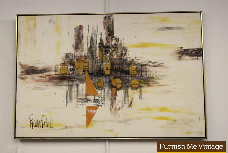 Huge vintage 1960s Mid Century Modern abstract expressionist art painting. This piece features a deconstructed city on a harbor image with buildings and sailboats broken down into almost cubist forms. Tasteful application of color with a mostly neutral palette. This is a suitable compliment to any retro 20th Century decor theme. In fantastic condition, and framed. Signed by the artist, Richard Patrick.