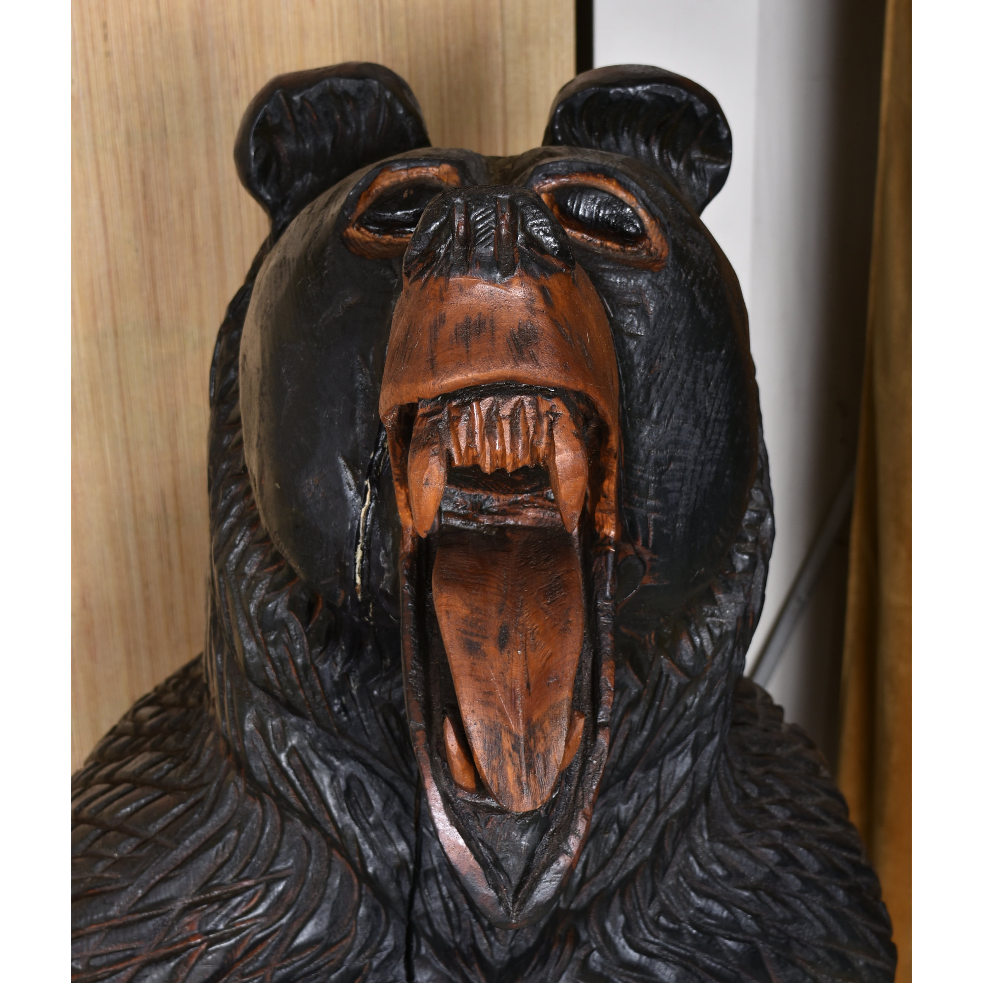 Stunning life size masterfully carved wood black bear sculpture. The 6 foot bear was carved from a single, solid block of wood and finished with remarkable attention to detail. The bear stands upright, forever captured in a powerful roar. This is not your docile, cuddly teddy bear. The artist has realistically captured the powerful majesty of the revered animal. Rich textures and expressive modeling capture the richness of the bear’s fur and might of his claws. The statue is finished in the round, making it a marvel to view from all angles. The sculpture stands on a wood plinth base that is joined to the bear, as it was all carved from the same log. In this piece, wood itself is celebrated as a material. The grain to remain visible through areas of the stain.