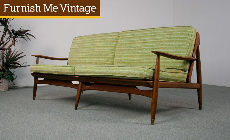 Retro Eames era sofa. Solid wood frame with Danish styling. All original fabric and finish! A time-capsule piece. Not your run-of-the-mill Scandinavian influenced couch. Take care to look at all of our photos. Note the remarkable detailing in the wood frame. Sculptural lines and reliefs along the bottom front edge. Pencil tapered legs are capped with brass feet. Angled back legs add visual dynamism. This angle gives a gentle reclined position to the couch, enhancing comfort. Metal spring supports below are taught and rust-free. Sure to last many more years to come. Matching lounge chair is available (sold separately). Buy both pieces to lend genuine authenticity to your vintage home.