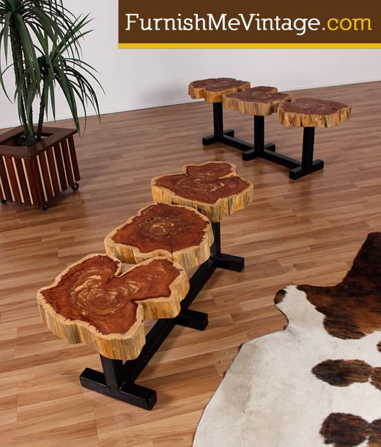 Pair of wood slab lily pad benches by Funktionhouse. Crafted from urban sourced lumber. Designed and produced by Funktionhouse. Bases are hand welded steel with black paint. Solid cross sections of Eastern red cedar form the lily pad seats. Oil finish allows the natural beauty of the wood to take center stage. Buy one or both. Pair with one of the Funktionhouse tables we have on view in our showroom. Available exclusively at Furnish Me Vintage.