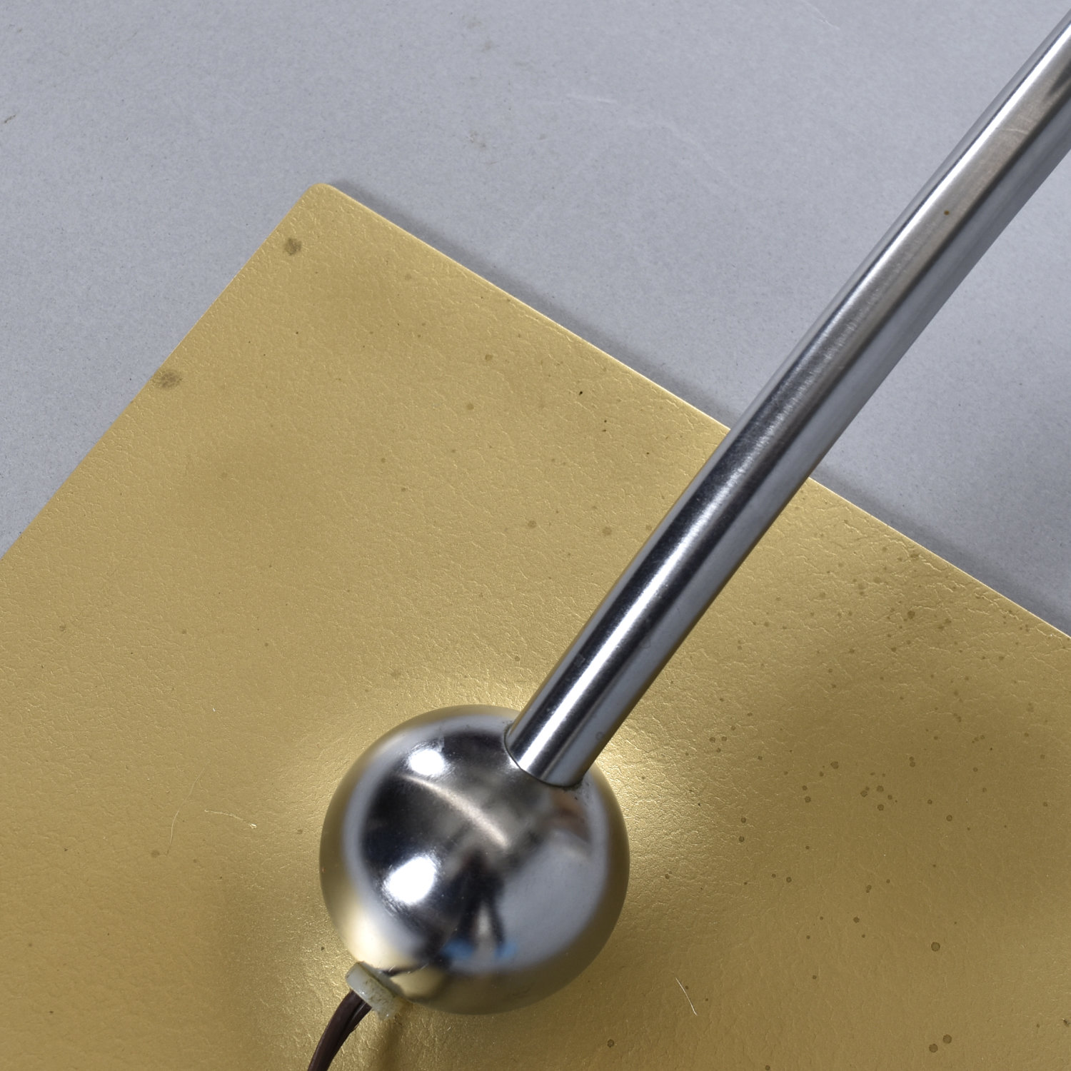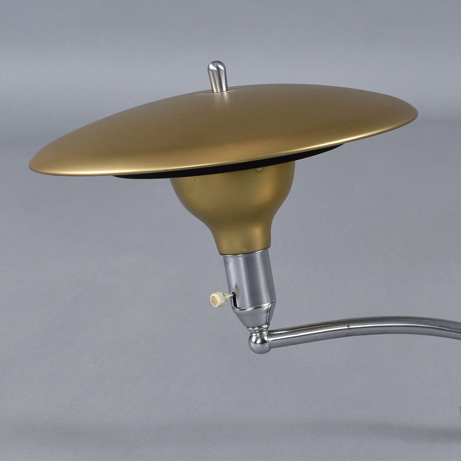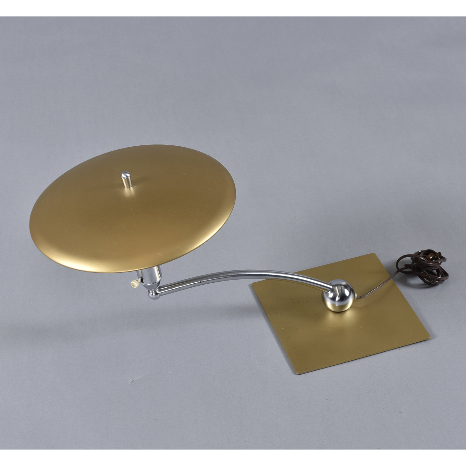 Novel mid-century modern Sight Light desk lamp by M.G. Wheeler. The space age lamp features a whimsical saucer shape. The design certainly captures the spirit of the era with it’s UFO silhouette. The overall aesthetic is more Machine Age with it’s steel construction and handsome chrome arch. The sturdy and stylish lamp is perfect for placement on a desk or work table. The lamp articulates! The ball at the base acts as a pivot point to rotate the lamp to desired position. Even better, this vintage lamp can use energy saving LED bulbs.