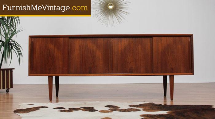 Mid century modern credenza by H.P. Hansen. Bearing the maker’s mark. Superior construction and craftsmanship. Deep orange patina to the teak wood garnered by age. Teak veneer over solid wood core (as opposed to composite board, typical of similar units). Ample storage capacity with 3 bay configuration. Doors glide easily, allowing effortless access to the interior. Left side holds a column drawers. Center bay is a wide cabinet with a single adjustable height shelf. Right side is another cabinet space. Front facade has a gentle bow, breaking free of the typical boxy form. Solid teak wood banding rounds the perimeter of the unit. Solid teak wood pulls are a subtle yet profound design. A prime example of the minimalist, smart, design that is Scandinavian Modern.