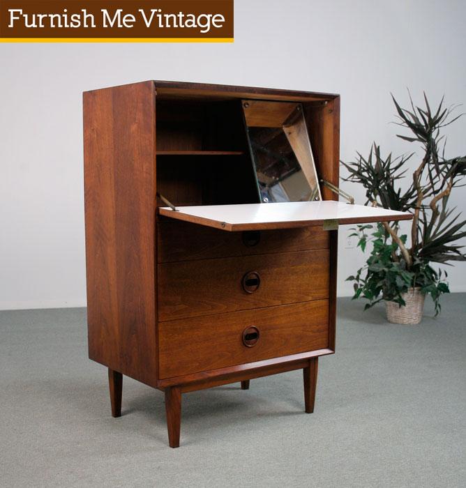 Versatile vintage dresser with cabinet. At first glance, it appears to be a high boy dresser with a gentleman’s vanity. This large cabinet space up top features an open cabinet on the left and a cabinet on the right. The right side cabinet holds a single shelf and is covered by a sliding mirrored door. The draw bridge door lowers to create a counter top. Likely originally mean to serve as a dressing station for a man. This piece can just as easily be used as a bar or secretary. Mix drinks, write, or compute on the white laminate counter service without fear of damage. Three large drawers below provide lots of storage. Rich, deep brown patina to the walnut wood. Danish styling especially evident in the solid wood sculpted drawer pulls. Top surface has been professionally refinished.
