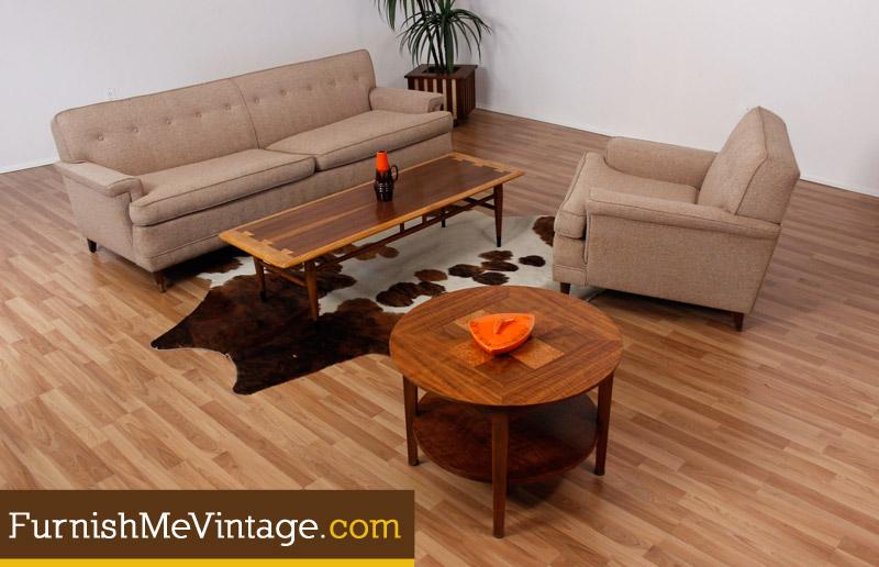 Mid Century Modern sofa (chair has been sold). Beige colored, tweed, vintage fabric. Recovered some decades ago. Retro look with comfort suiting today’s standards. This listing is for the sofa alone. Coffee table, end table, and accessories are sold separately.