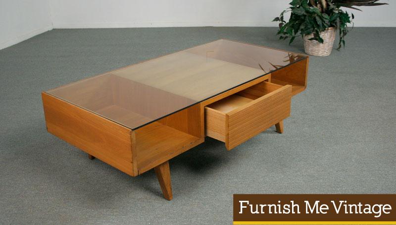 Retro 1950s blond coffee table. Glass top is easy to maintain. No worries of water rings here. Storage spaces on the left and right side. Drawer in the center is ideal for stowing remote controls. Fantastic atomic age appeal! Maple wood construction with angled legs. Wood tone is similar to what youƒ??d find with Conant Ball, Baumritter of New York and Heywood Wakefield furniture of comparable vintage. We have matching end tables, console table with planters, and display case (all sold separately). Ideal for setting the tone of your vintage 1950s space.