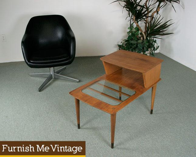 Early Mid Century 1950s era blond wood two-tier step table. An end table with character. This piece exhibits all sorts of little design element goodies. Very atomic age in it’s long, tapered pencil legs. The top level of this end table has a slight “V” like shape. A glass inset, resting on flattened, smooth, spindles, is the perfect table top surface. No coaster chasing required, just sit your cup on the glass. Note the exaggerated screw-top feature on the top surface.