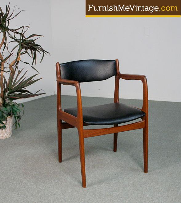 Mid Century Modern Danish teak arm chair. All new black vinyl upholstery on the upper and lower cushions. Stylish contoured, solid teak wood frame. Easy to maintain. Wipe away spills from vinyl upholstery.