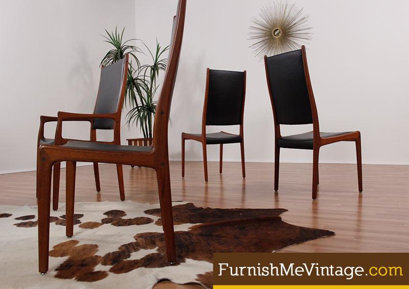 Only three side chairs remain. The arm chairs are no longer available. Unusual, upholstered high back design. All newly upholstered in high quality black vinyl fabric. Easily wipe away spills with no worries of stains. Dainty profile signature of fine Scandinavian design. Back rests have a gentle ergonomic curve to support he spine. Blade like upper nearly disappears at the side view.