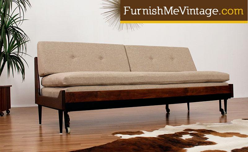 Mid Century Modern Danish style daybed sofa with trundle bed. New beige tweed style upholstery. Sleek looking couch by day, pull out the lower compartment to create near queen size bed. Bottom trundle is on caster wheels and glides out with ease. One person can operate this bed with no trouble. Wood frame has an architectural look with sharply sculpted sides. Ideal for a living room that must double as a guest room. Also great for live/work spaces.