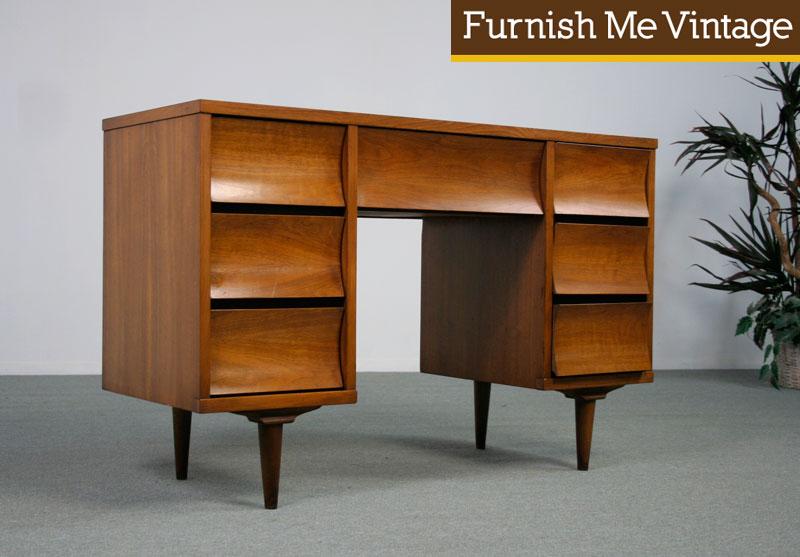 Vintage 1960s desk by American manufacturer, Johnson Carper. Rich color to the walnut wood body. Top surface is a wood pattern Formica. Practical desk with lots of storage. Seven spacious drawers. Minimalistic look with no hardware on the facade. The gently curved drawer fronts act as the pulls. Dovetail joinery is evidence of fine workmanship. Corresponding DUX Danish teak chair pictured is sold separately.