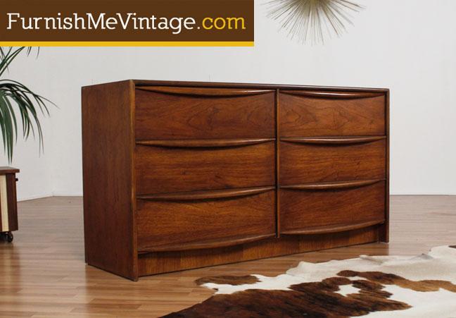 Retro dresser with sculpted lip pulls. Ample storage with six spacious drawers. Easy gliding drawers make daily usage a breeze. Gentle curvature along the drawer facades. Art Deco inspired contours resemble forms found in Heywood Wakefield pieces of the period. Matching high boy dresser available (sold separately). We also have a king headboard that would pair nicely with this set.