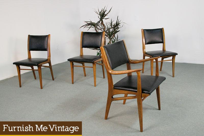 Vintage dining chairs designed by John Van Koert for Drexel. This set consists of 4 chairs, one arm chair and three armless side chairs. Professionally reupholstered in high quality black vinyl. Walnut and pecan wood construction with sculptural design. Beautifully sculpted. The soft curves show Van Koert’s experience as a jewelry designer. Van Koert specifically intended to have “no abrupt angles” in his Profile collection. These retro chairs are from Van Koert’s “Profile” line for Drexel. Produced from 1955-1961. We also have a desk, end table, and dining table from this collection (sold separately). Read