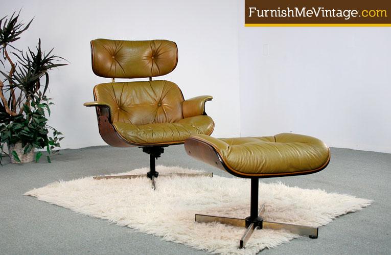 Vintage Eames style lounge chair with matching ottoman. Atypical butterscotch color leather seat upholstery. Dark walnut bent wood frame contrasts nicely against the warm tone leather. Tilt back and rotate in this practical easy chair. This is a chair that near single handedly defines Mid Century Modern American design. Modeled after the iconic easy chair by legend Charles Eames for Herman Miller. This decades old, retro, look-a-like achieves the same cachet and comfort Eames aimed for. Matching ottoman is included.