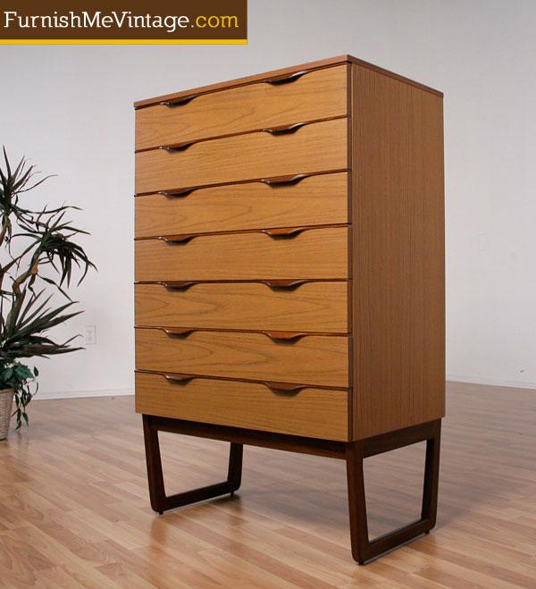 Absolutely stunning Mid Century Modern Danish teak dresser. High boy dresser with a stack of seven wide drawers. Solid wood sculpted pulls. This dark wood accent continues from the handle to the top edge of each drawer. Unique trestle leg is a red-brown color, coordinating with the drawer pulls. Teak has an opaque factory finish. This finish is a creamy brown as opposed to the warm orange tone of other period teaks. Matching queen headboard and vanity available (sold separately).