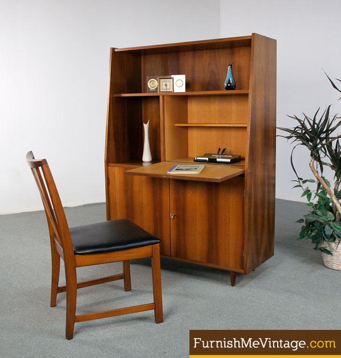 Magnificent Mid Century Modern German bookcase with secretary. Beech wood construction with birch inside the cabinets. Take a moment to admire the spectacular patterning on the wood grain! Vintage 1950s, imported directly to the states by a military family. Unit comes with both original keys. Keep your belongings safe with a locking secretary and bottom cabinet. A stylish, compact desk for those living in small spaces. Plenty of storage with exposed shelving above. Lower portion hosts a large cabinet with a single shelf. German pieces rarely become available on the American market. Make this unique piece a part of your retro collection.