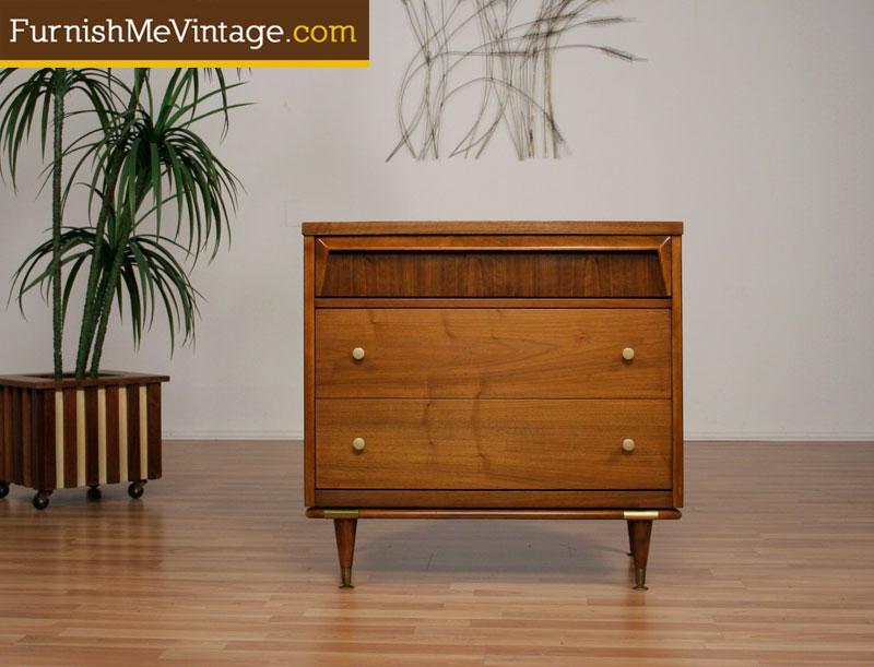 Handsomely accented Mid Century Modern three drawer chest. This petite dresser packs plenty of pizazz. Buttoned down with gold knobs like a well dressed man. Brass colored plates highlight the transition from chassis to foot. Top drawer commands attention with a solid wood sculpted ridge that acts as the pull. Opposing wood grain on the top drawer facade creates contrast. Big style in a small package.
