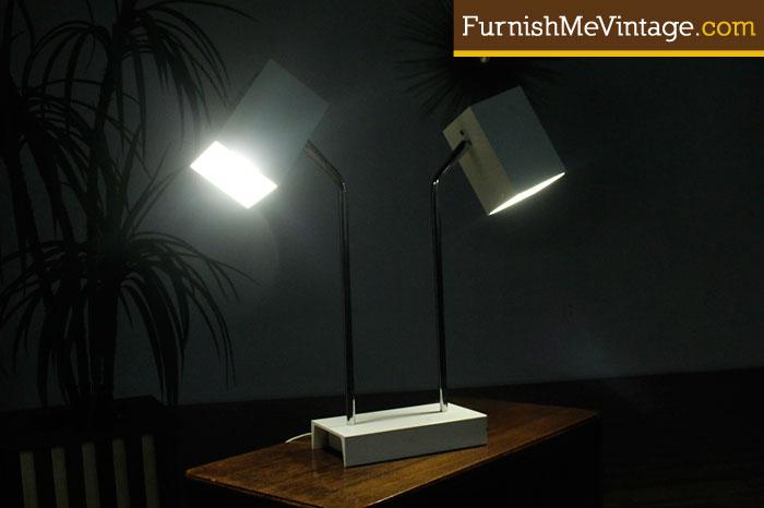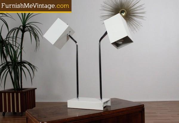Mid century modern Robert Sonneman for George Kovacs table lamp. Dual head design. Both lamps working. Original white enamel paint. All metal construction, even lamp shades. Each had has an individual switch. Use one singularly, or simultaneously. Lamp heads can be adjusted directionally.