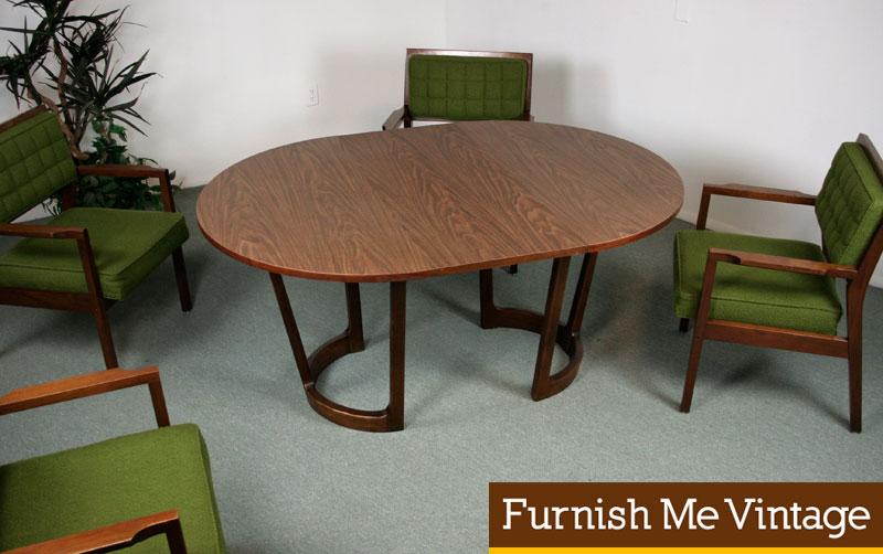 Vintage 1960s era dining table by Lane. One of the most stylish American manufacturers of the atomic age. The walnut pattern Formica table top rests on a walnut wood pedestal base. This pedestal expands to accommodate a single large leaf. Comfortably seat 4-6 people. The chairs shown in the photo are sold separately. Formica top and round edges are ideal for homes with children. No worries of sharp corners or ruined table tops. Easy to maintain, just wipe clean.