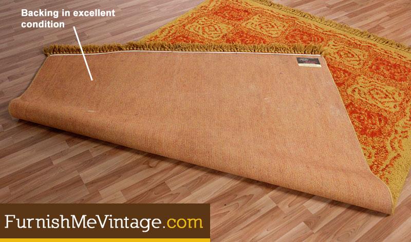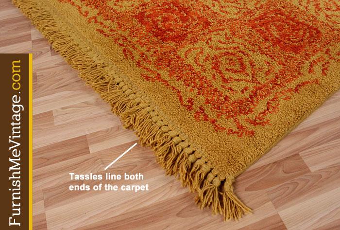 Retro Alexei Karastan wool rug. Mustard yellow with red orange pattern. Label on the back denotes size, 6 x 9 feet. This particular model is “Persian Sunset.” Tassles embellish the left and right ends. Back label states that the carpet is moth proof. Perhaps one of the reasons why this decades old area rug is in such outstanding condition.