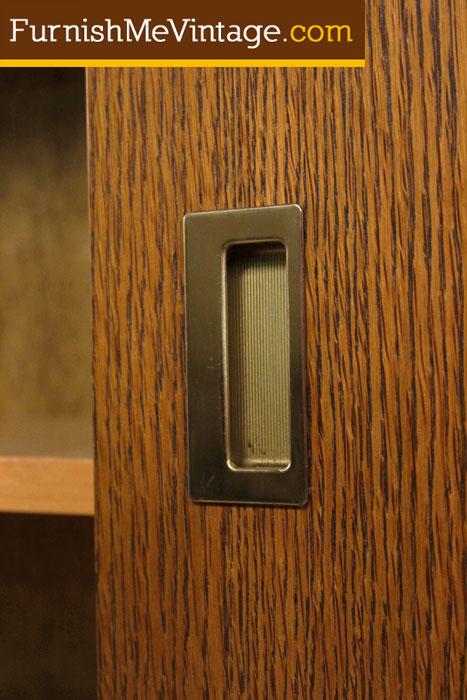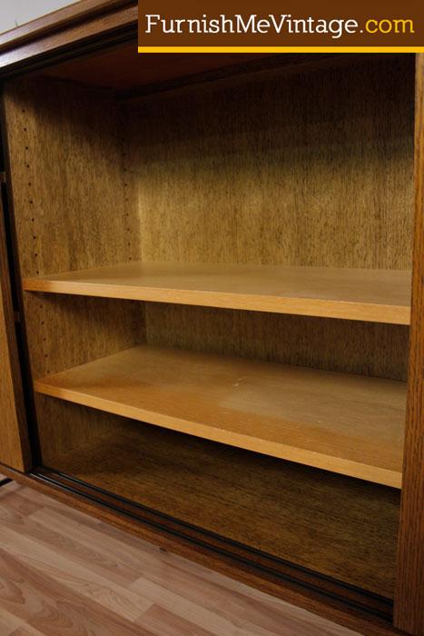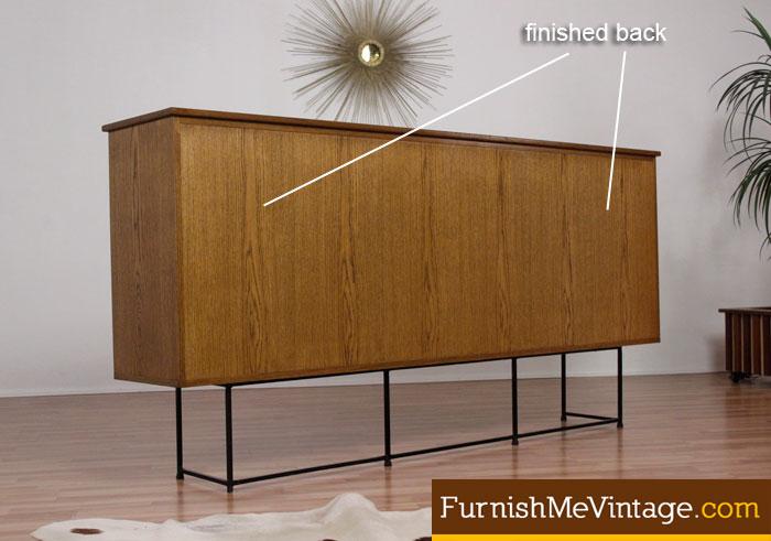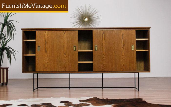 Monumental in stature and design. Large American made mid century modern oak sideboard. Stunning wood grain through out. Cabinet rests on Paul McCobb style black wrought iron base. Three bay design with easy gliding doors. Two adjustable height shelves per bay. Tremendous amount of storage. Ideal for book collectors. Stow away your treasures safe from light and dust. Doors features recessed gold colored hardware. Exceptionally well built. Finished back side. Use as a room divider in open room plans. An impressive sight in person. Stop by our shop to see it firsthand.