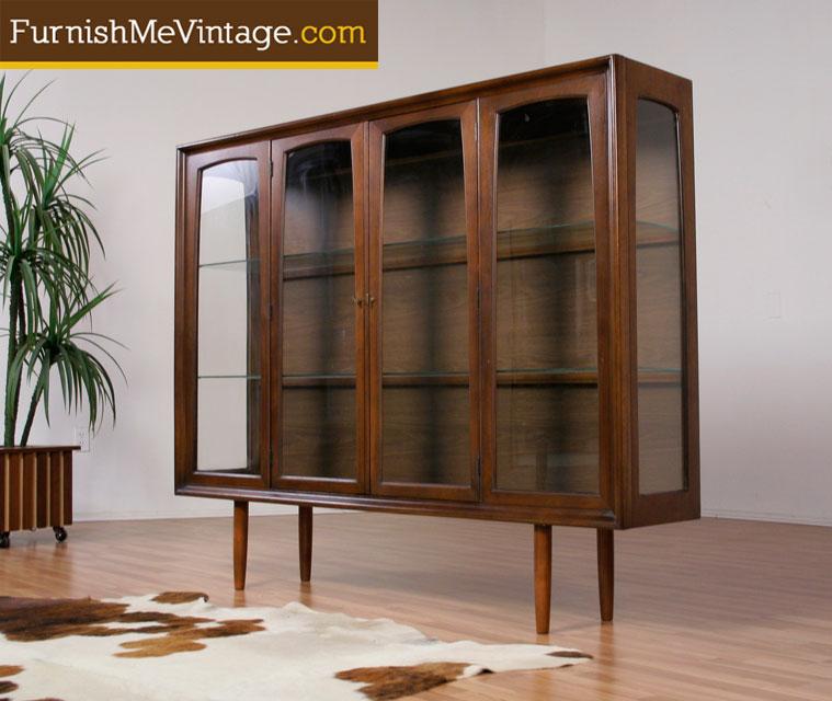 Large Mid Century Modern walnut china cabinet. Four glass panels on the front and two on the sides allow your treasured items to take center stage. Lighted from above. Two lights, independently control each with a switch. Interior holds two glass shelves inside.