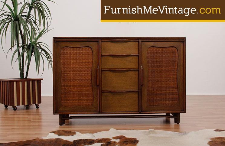 Mid size retro mahogany credenza. Beautifully contoured solid mahogany pulls. Small size, but lots of storage. Column of four deep drawers at center. Top drawer is felt lined with dividers. Left and right side of the unit hosts cabinet spaces. Single fixed height shelf in each cabinet. Doors are accented with caning in a quatrefoil silhouette. Mahogany construction.