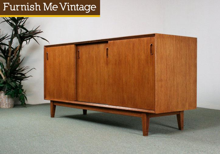 Amazing amount of functionality with sliding doors along the front. Wide cabinet spaces below feature adjustable height interior shelves. Divided into three spaces, front, left and center. Each cabinet holds a single felt-lined drawer up top. Brilliant blond colored maple wood veneer on the exterior with maple lining the interior as well. Danish styling with inset carved handles. Construction closely models Scandinavian Modern design.