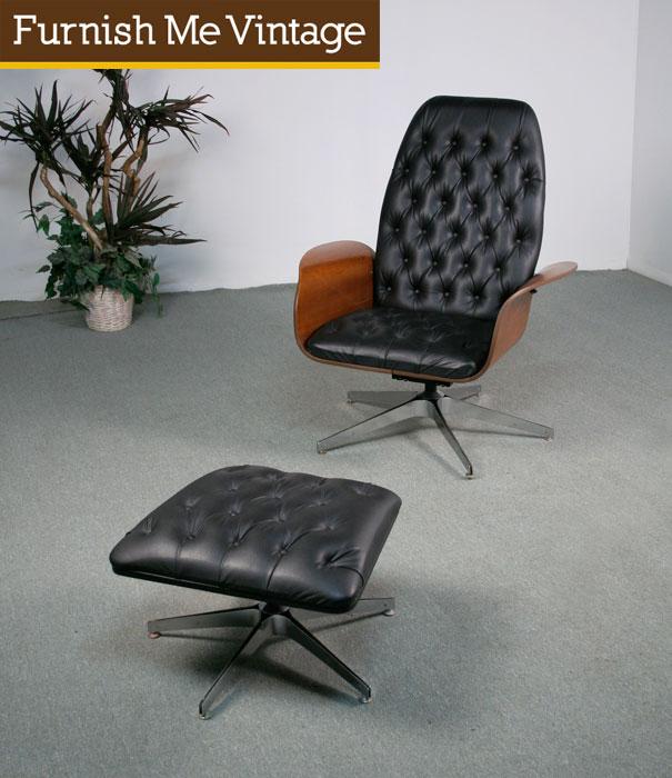 Bentwood frame with black vinyl tufted upholstery. All original vintage 1960s George Mulhauser style lounge chair. Owned by one family all these years. Walnut wood bent frame radiates with rich patina. Metal five star base is rust free. This chair rocks and swivels 360 degrees. Matching ottoman accompanies the lounge chair. A stylish alternative to an Eames lounger.