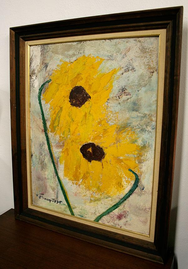Vintage 1960s Eames era signed and framed painting featuring two large yellow flowers. Acrylic paint on Masonite. Elegant composition, still life, nature scene. Primitive, painterly strokes. Amazing texture and integration of color. Contained in a walnut frame, no glass.