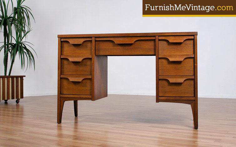 Glorious Mid Century Modern pecan desk. A handsome, practical home office solution. Compact size, but lots of storage. Seven drawers allow one to stow supplies and documents. Exceptionally stylish. Solid pecan sculpted drawer pulls draw admiration. Sleek Scandinavian Modern profile. Top surface has been outfitted with all new wood veneer. Light glitters through the iridescent wood on the top. Back side is unfinished. The pecan wood has a warm orange, teak-like patina. Come see this desk in person! You will fall in love.