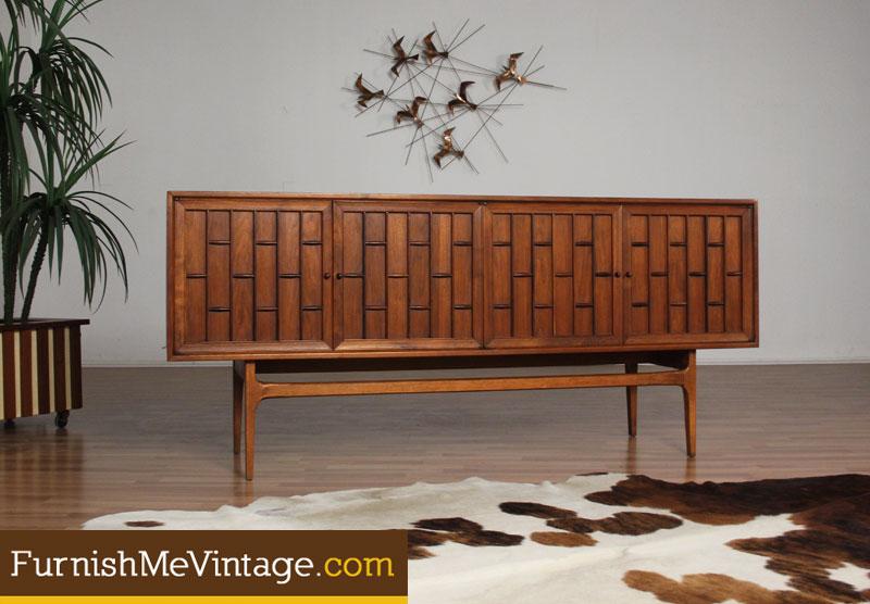 American construction could easily be mistaken for authentic Danish. Walnut wood body with rosewood lattice edifice. Unusually dainty elements for an American piece. Rosewood pulls are exceptionally crafted and petite. Bottom trestle base exhibits similar, atypically keen sculpting. Practical as it is beautiful. Left side holds two large spacious drawers. Right side of the unit features an ample cabinet space. Use as an entertainment center or sideboard. An heirloom piece sure to set your collection apart.