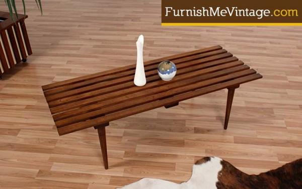 Retro slat bench table. Use as a bench or coffee table. Walnut wood construction. Sleek, pencil tapered legs. Original vintage condition.