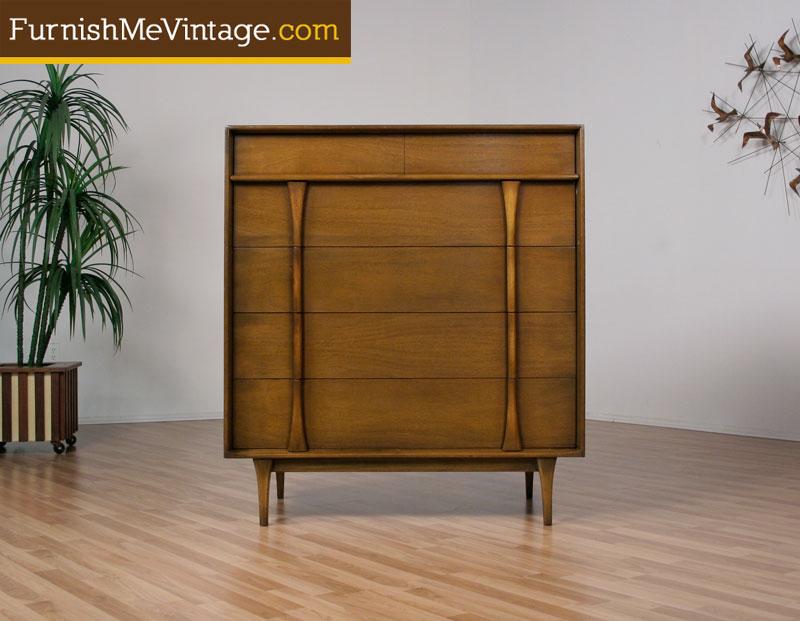 Mid Century Modern large high boy dresser. Stamped “made in Sweden.” Wider than typical high boys of the period. This translates to plenty of storage. Drawers are wide and deep. Front facade is embellished with solid wood carved ribs that act as the door pulls. Sleek Scandinavian design. Top has been professionally refinished.
