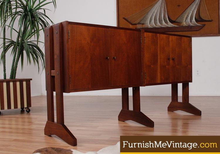 Mid Century Modern Danish teak credenza. Narrow depth makes this piece unique. Easily place this in your tight dining area or hall way. Open the doors to reveal a single shelf in each cavity. Back sides are finished. Previous owner drilled a hole in the back for wires. Matching single cabinet unit with draw bridge door available (sold separately).