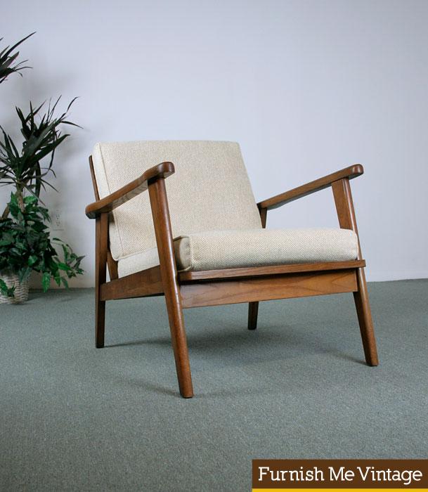 Handsome Danish style vintage Mid Century Modern Lounge chair. Likely American made, solid wood Scandinavian inspired 1950s/1960s Eames era. Newer tweed upholstery in a natural ivory tone. Durable and thick fabric, will hold up for many years with regular daily use. All new nylon webbing supports below the seat cushions. Frame is sturdy with no loose joints.