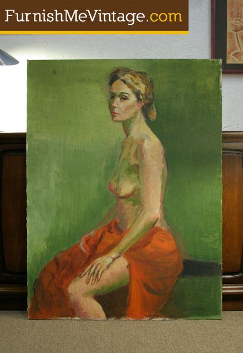 Large Post-Impressionist female nude portrait. Painterly brush stroke accented by contrasting hard lines illuminate the canvas. Style very much in the manner of Paul Cezanne. Complimentary colors of green and red work strongly together to create a striking image. Signed by the artist, Jean Murrin.