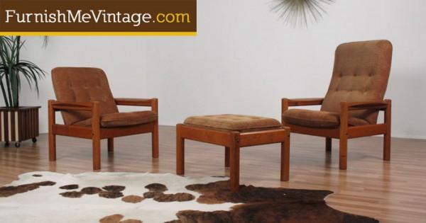 Pair of vintage Danish Modern lounge chairs. Teak wood frames with soft, velvet like fabric. One high back chair and one low back chair. Set comes with one ottoman. Original fabric is a burnt orange / beige blend which gives a warm brown appearance. Matching