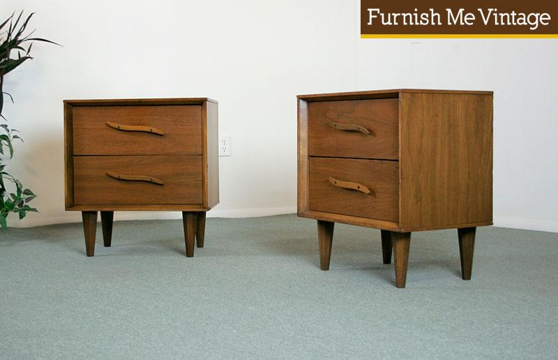2 Medium tone walnut retro nightstands. Each of the nightstands features two wide and deep drawers. Lots of private storage. A solid wood, sculpted “S curve” act as the drawer pulls. In fair vintage condition with several patched veneer chips on each of the nightstands. Mostly around the perimeters… not glaring flaws, but there nonetheless. Price reflects flaws.