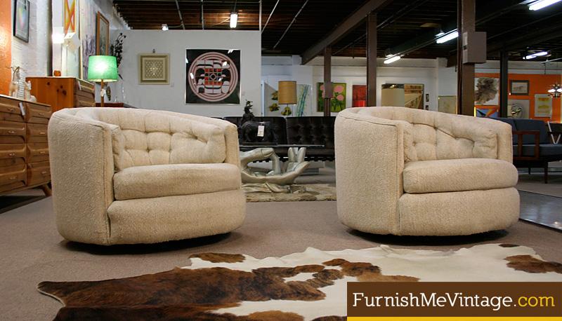 Matching pair of retro Post-Modern tub chairs. Super comfy with lots of padding. It’s as if the chair hugs you when sitting. Luxurious tufted motif along the back cushion. Neutral beige tweed style nubby fabric is in excellent shape. These chairs may be authentic Milo Baughman’s. However, they are unmarked, so use your own discretion. Chairs swivel 360 degrees with ease. Large and cozy, these chairs satisfy a Mid Century Modern aesthetic while keeping with today’s level of comfort.