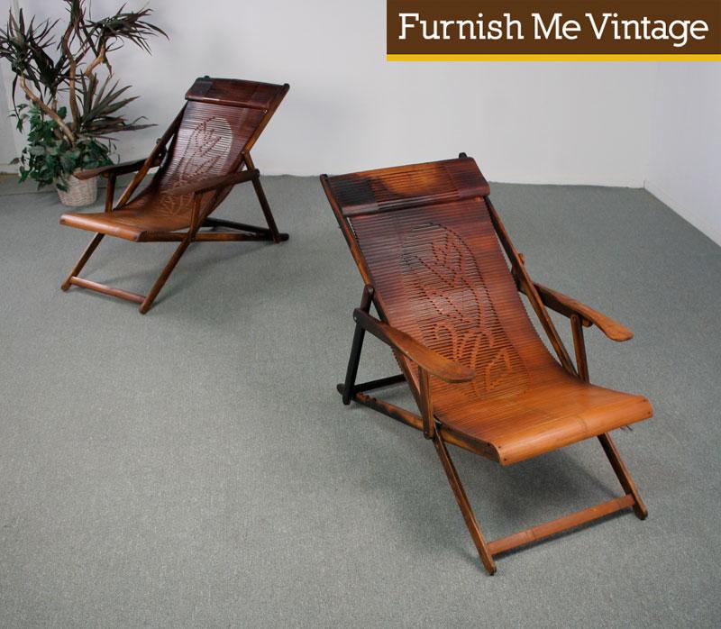 Remarkable pair of vintage deck chairs. Appear to be made of teak wood. Each chair folds and reclines incrementally. Origins and age are ambiguous. The large flower like design in the center is reminiscent of South Asian motifs. Slatted construction is particularly unique. Fine details include the contoured head rest and blade like arms. Years of salt water and sun have given the chairs a charred look. Almost looks like they were burned by a wild flames. Surely a patina that cannot be easily replicated. Each chair is structurally sound. However, they may not be ideal for heavy use or large people. Fantastic statement pieces for your collection.