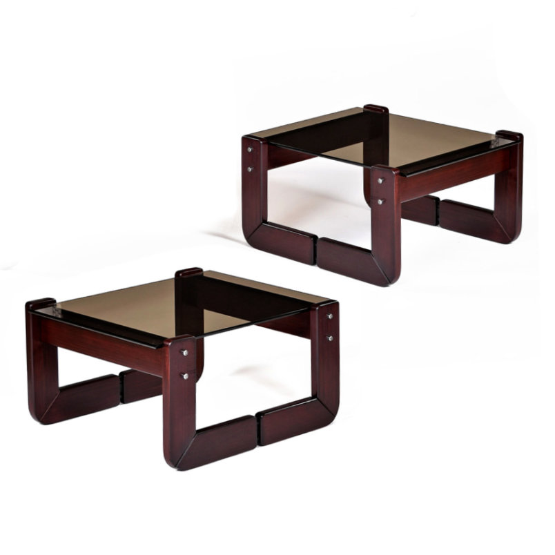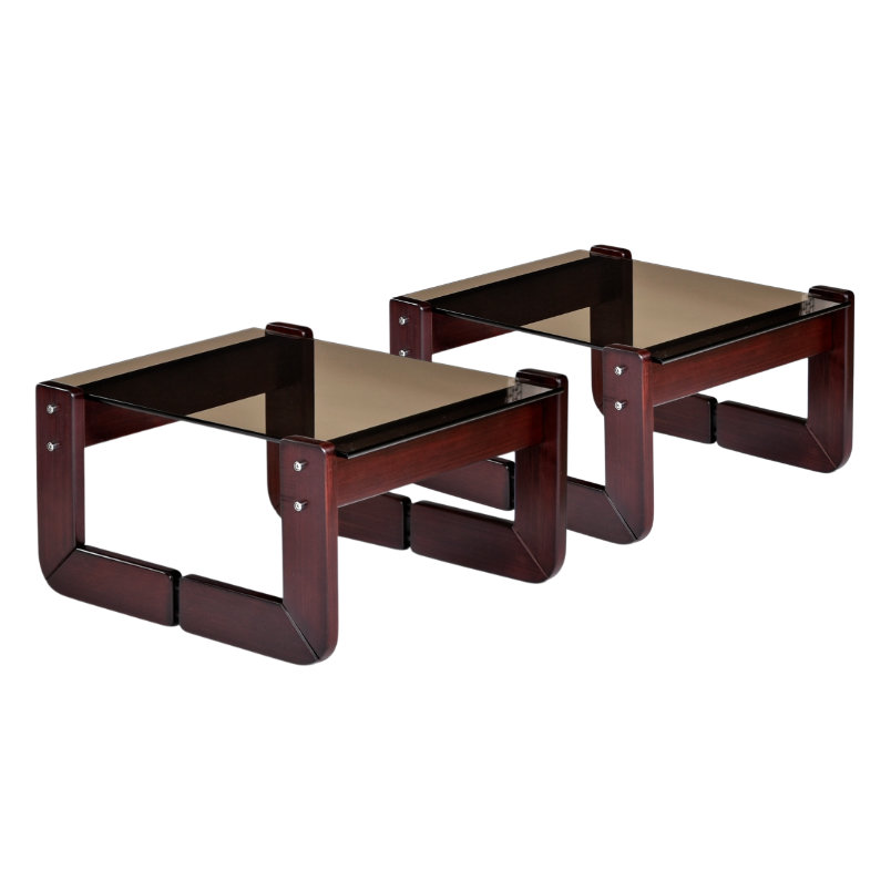 Nineteen-Laties Percival Lafer smoked glass end table set. Vintage 1970s. Stamped “Made in Brazil” on each piece. Sculpted solid Brazilian rosewood base with deep rich, red patina. The low profile side tables feature their original warm brown smoked glass. The frames are tastefully complimented by the chrome metal hardware which can be seen on the side view. The lower height perfectly compliments vintage low profile sofas of the era. You can also arrange the tables side by side to create a coffee table.