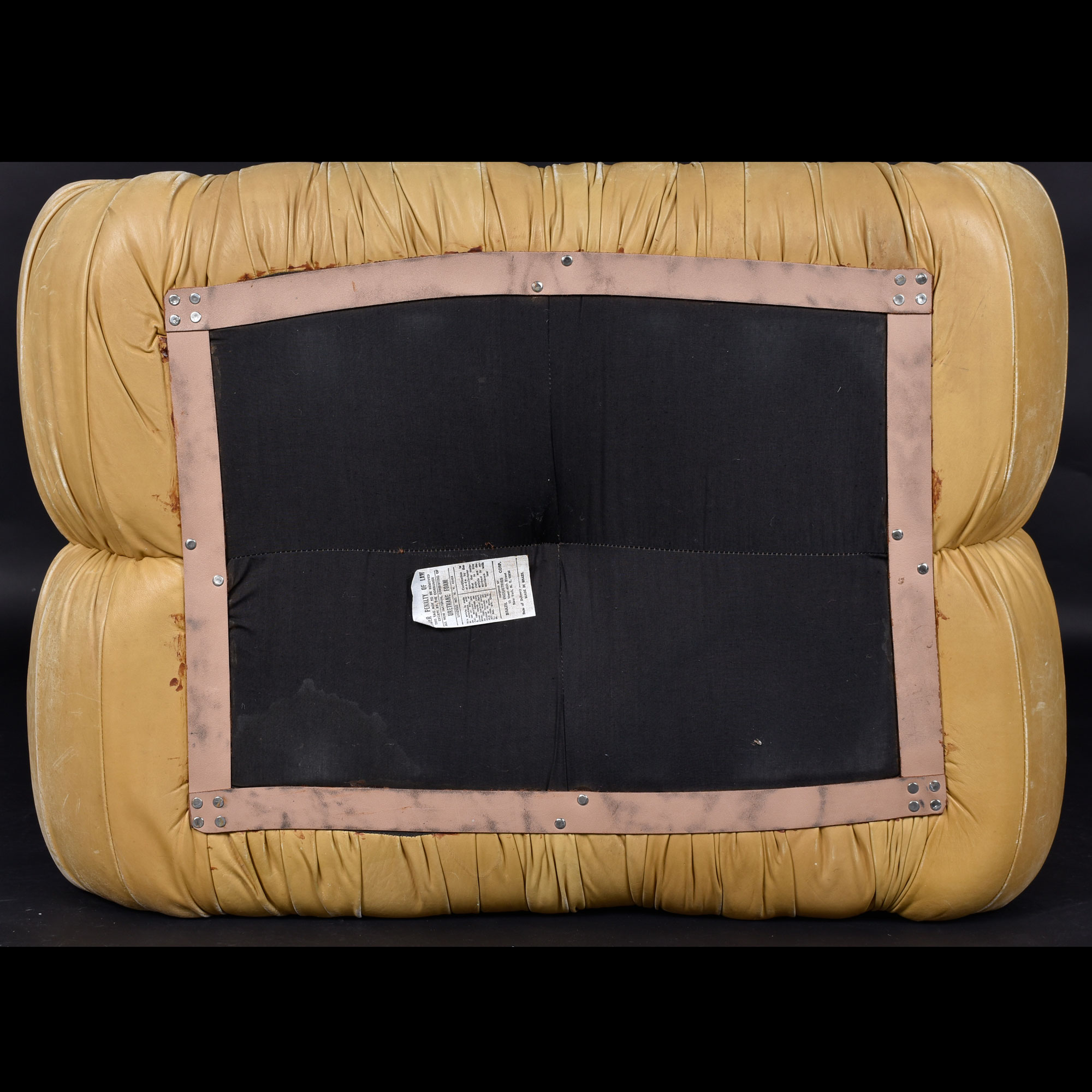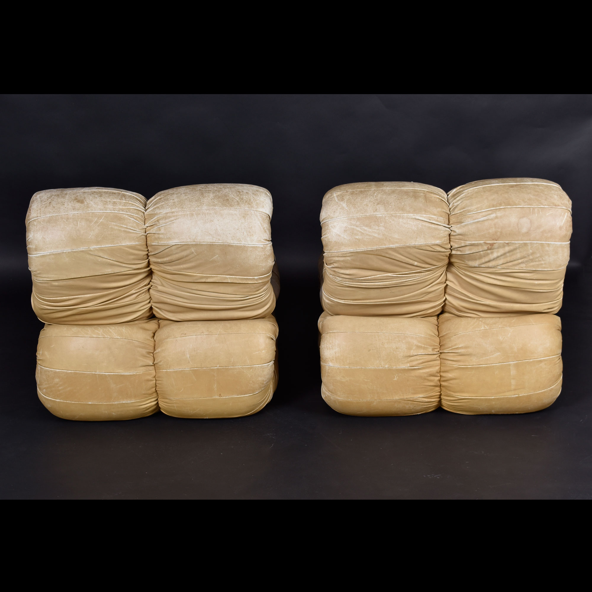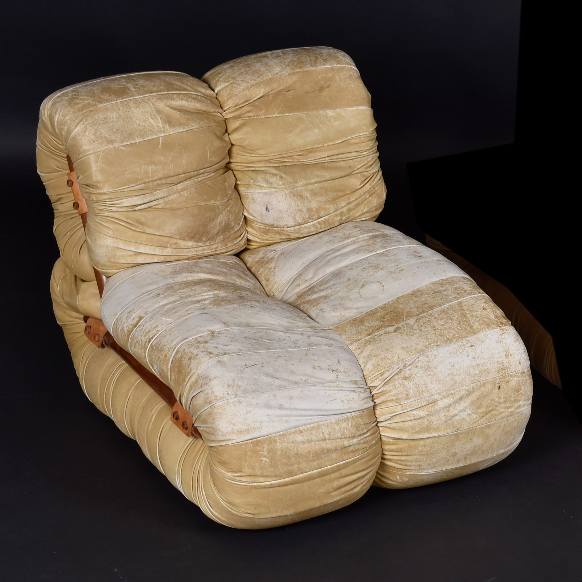 The MP-116 series is one of Lafer’s most sculptural and expressive designs. Each chair is composed of four individually upholstered cushion-blocks arranged in a clean 2×2 configuration that produces a low, architectural profile balanced by generous comfort. The cushion-block construction gives the chairs a distinctive visual rhythm, while the original tan leather displays the deep patina, creasing, and color variation characteristic of five decades of natural aging. One chair includes a small puncture in the leather, and both pieces exhibit areas where the upholstery has become fragile. Although they remain comfortable and structurally sound, reupholstery is recommended for long-term use.