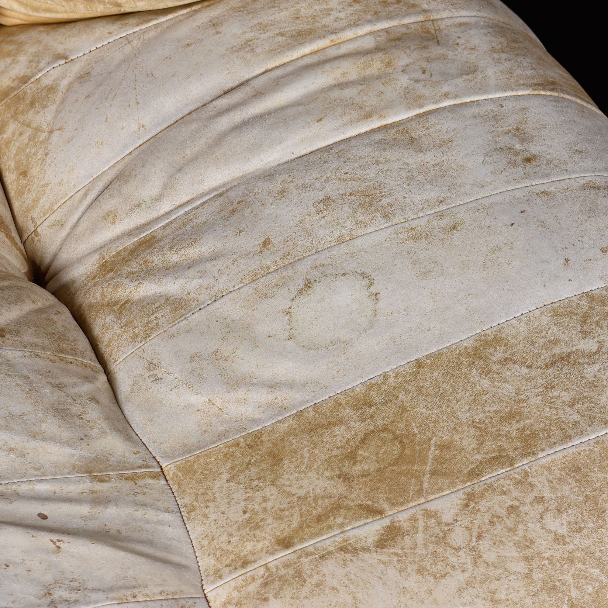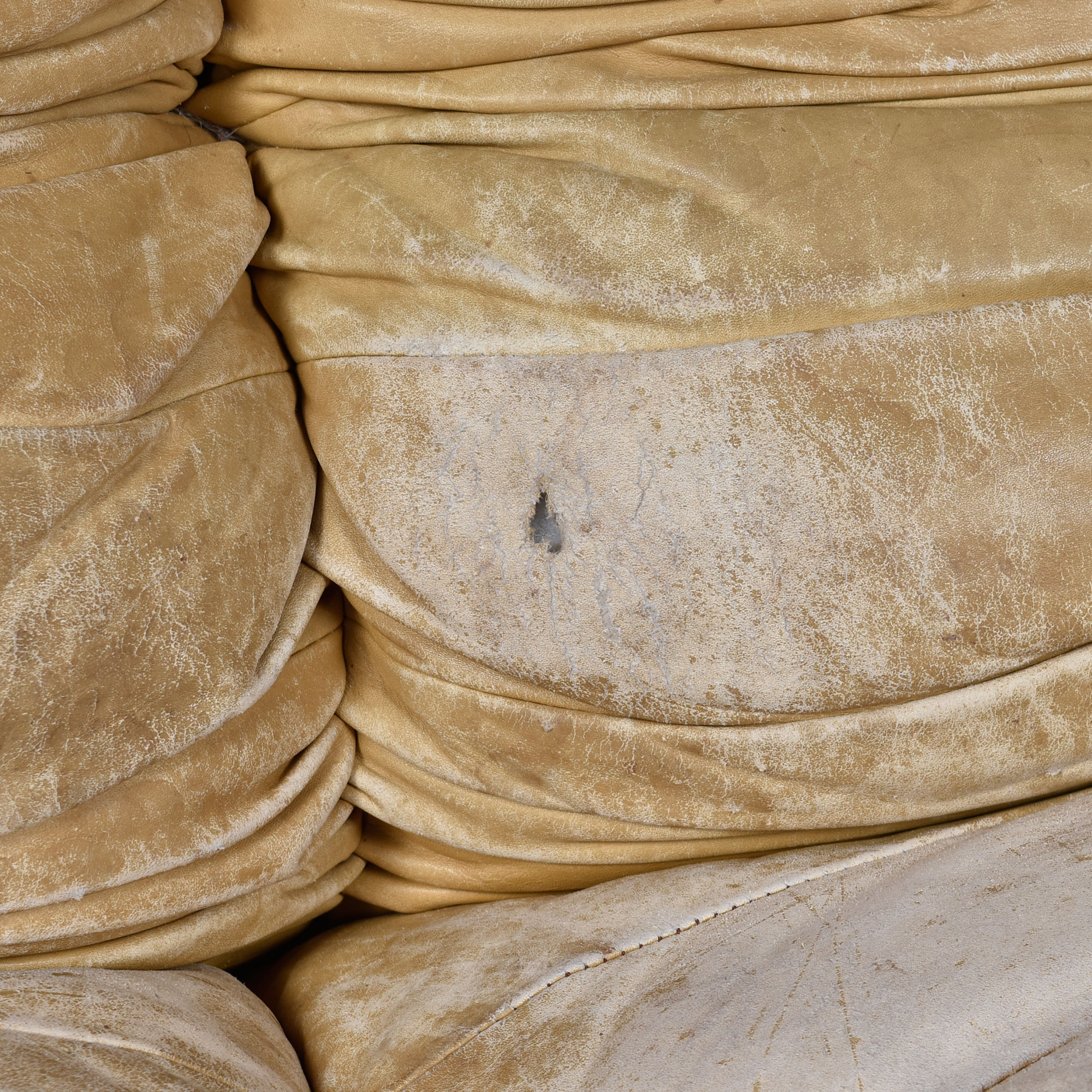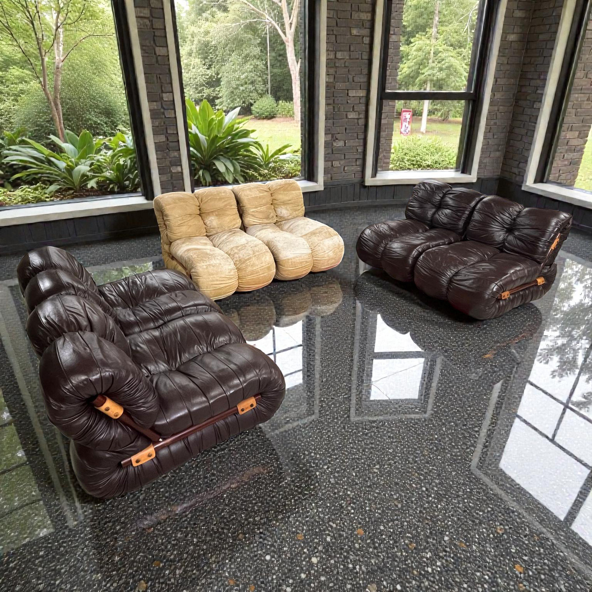 The MP-116 series is one of Lafer’s most sculptural and expressive designs. Each chair is composed of four individually upholstered cushion-blocks arranged in a clean 2×2 configuration that produces a low, architectural profile balanced by generous comfort. The cushion-block construction gives the chairs a distinctive visual rhythm, while the original tan leather displays the deep patina, creasing, and color variation characteristic of five decades of natural aging. One chair includes a small puncture in the leather, and both pieces exhibit areas where the upholstery has become fragile. Although they remain comfortable and structurally sound, reupholstery is recommended for long-term use.