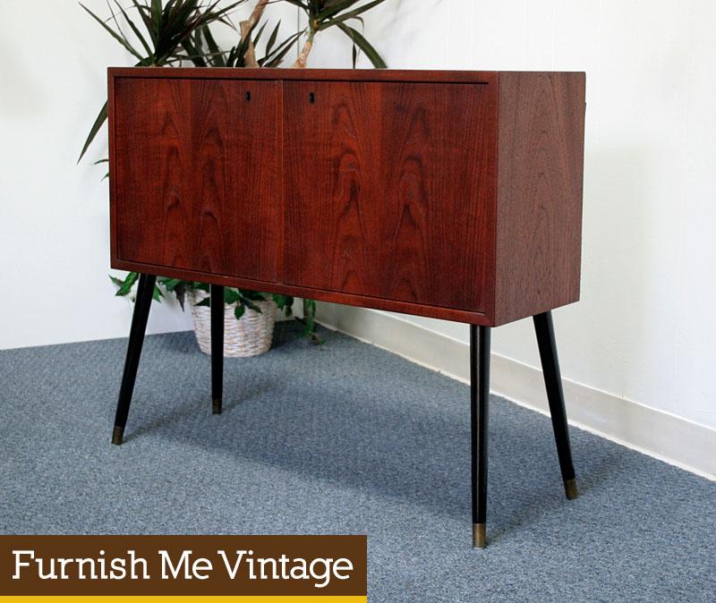 Mid Century Modern Danish teak vintage cabinet. This small cabinet features a deep, rich, reddish patina to the teak wood. Two locks with keys are great for those with kids, or roommates. Tall atomic style, dainty black legs support the cabinet. There is a circular hole masonite backing for electronics wires.