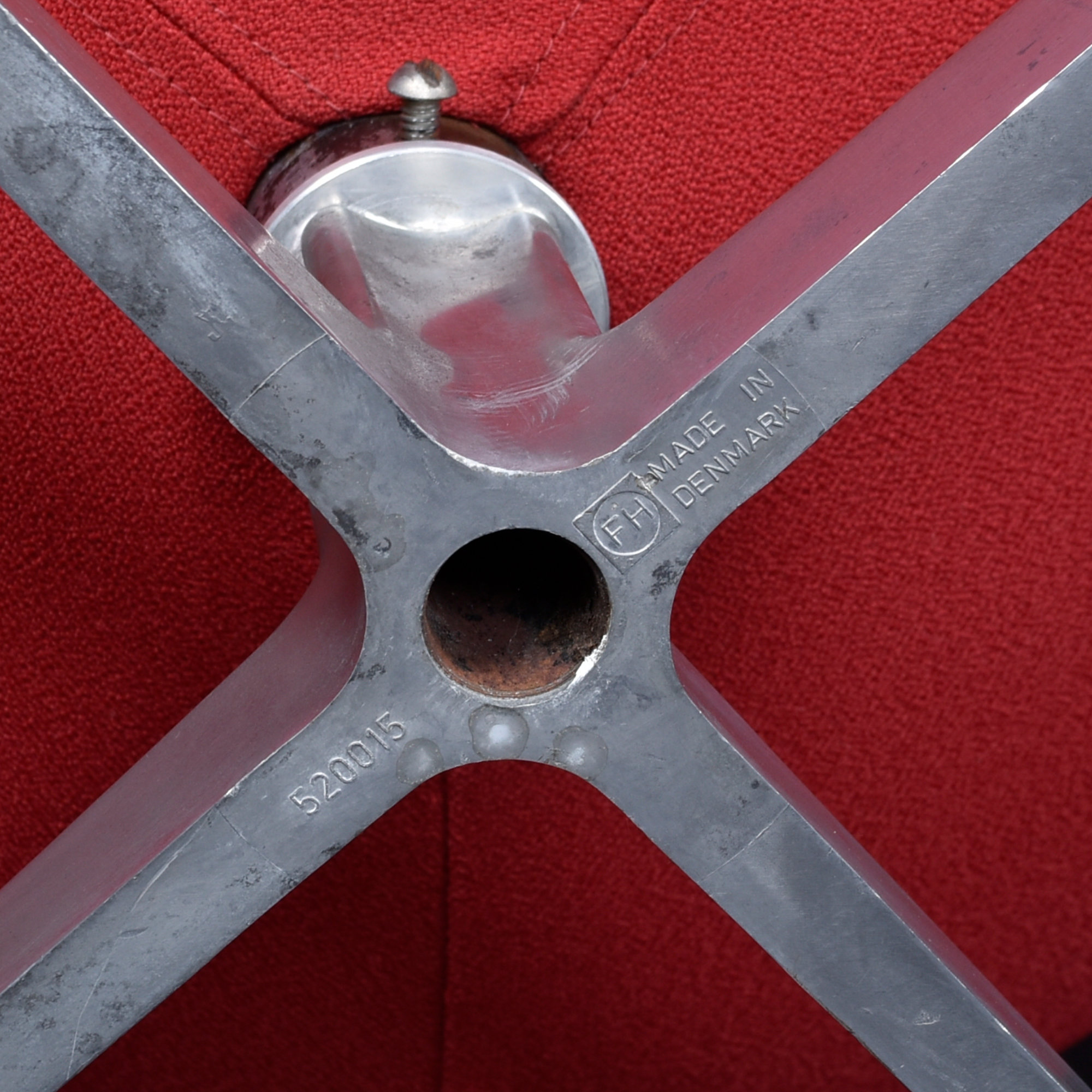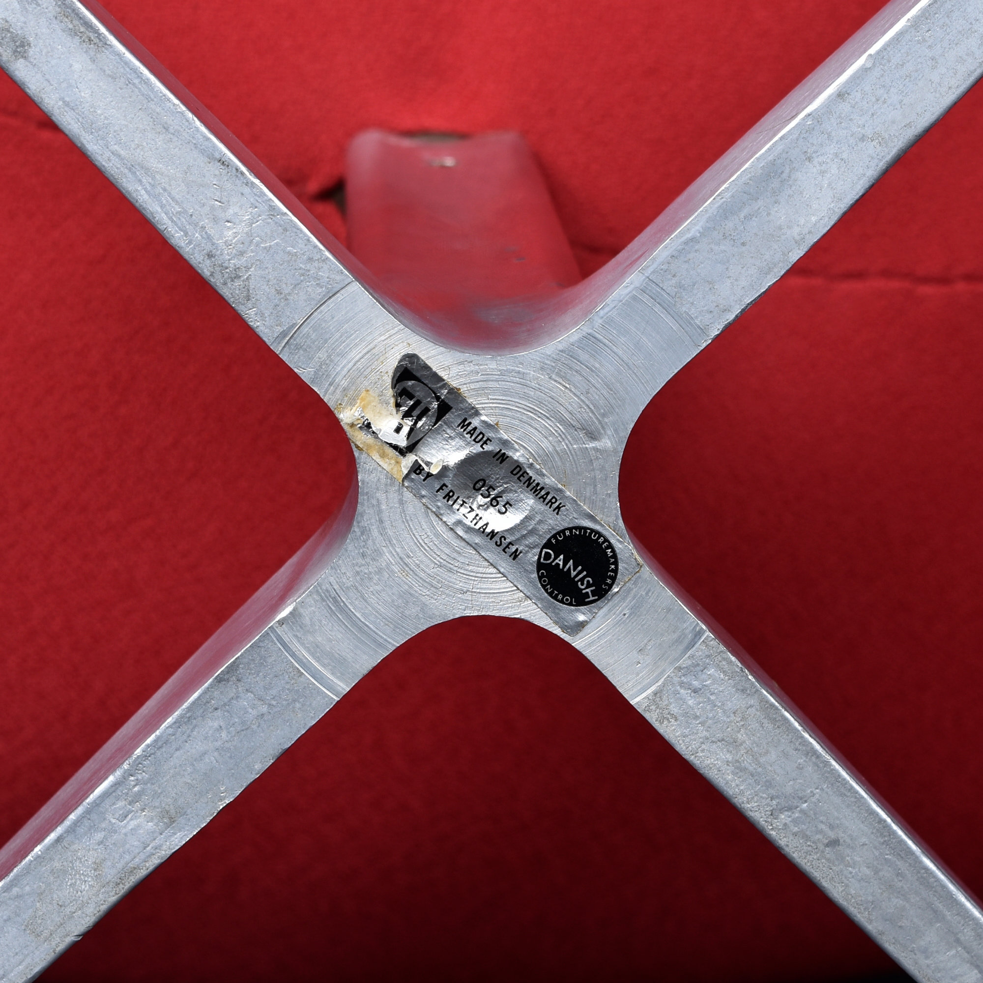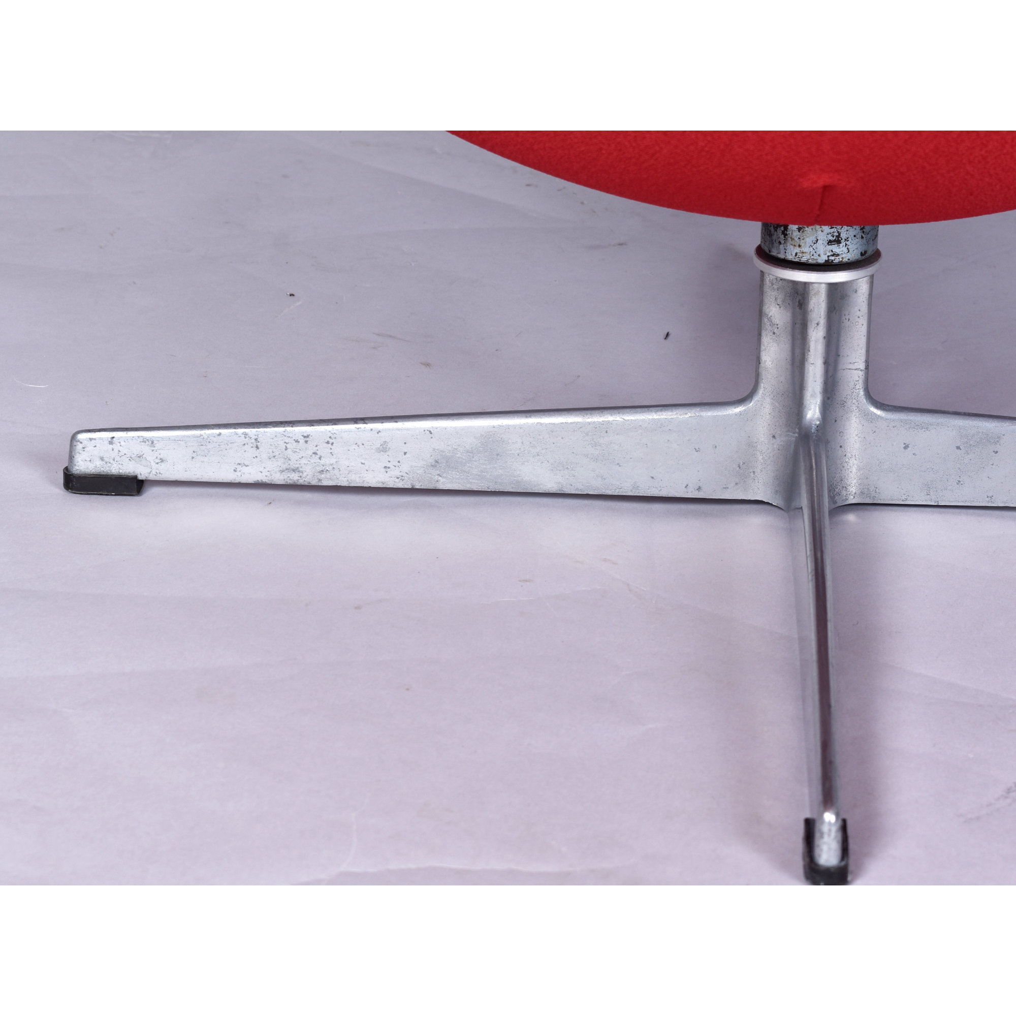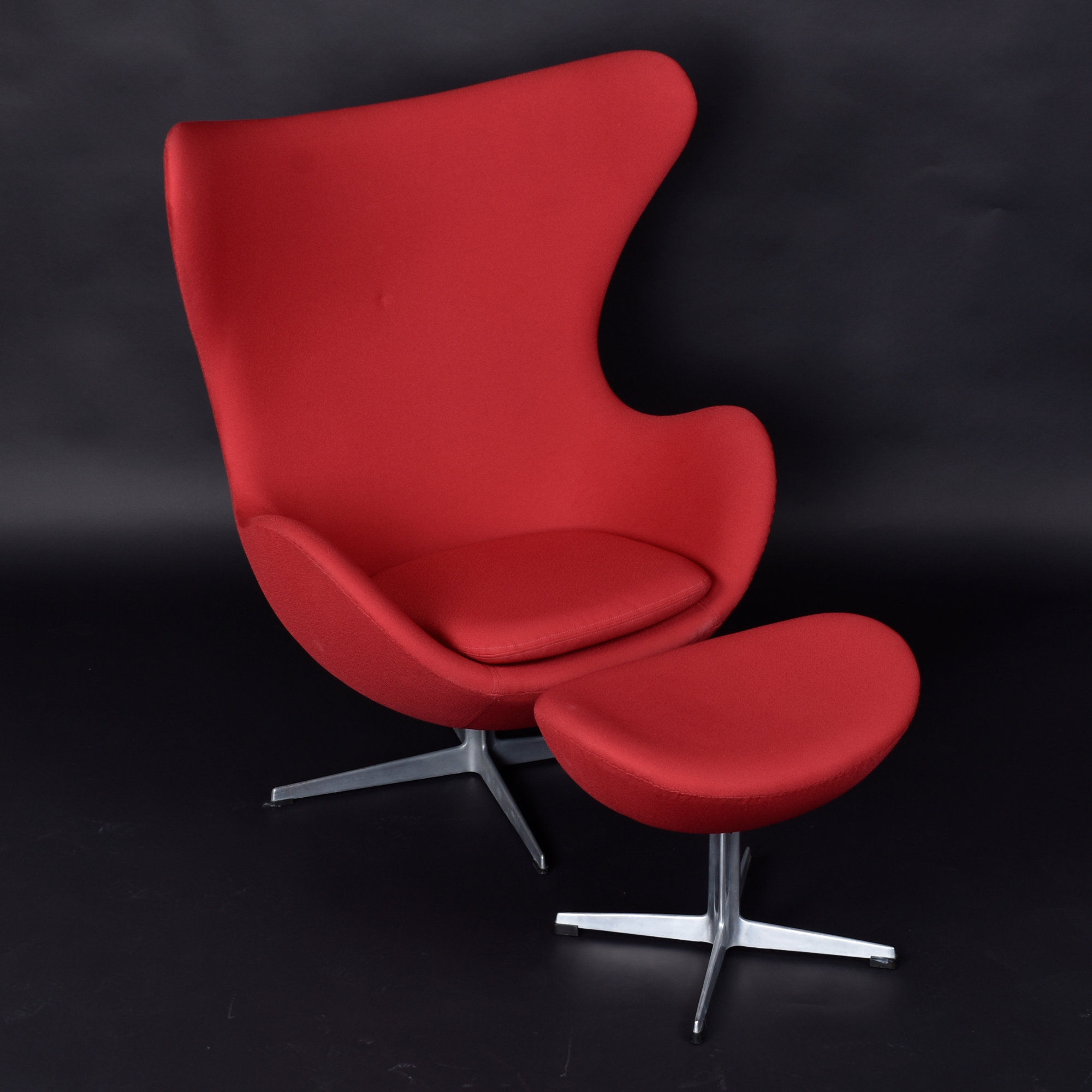 Vintage, restored, Arne Jacobsen for Fritz Hansen Egg Chair with ottoman. The chair has only had one owner up til now. Originally purchased in Los Angeles in the late 1990s. The chair and ottoman have since been updated by the original owner in this sumptuous cherry red boucle fabric. There is a Fritz Hansen, made in Denmark and serial number embossed beneath the chair base. The ottoman has the paper Fritz Hansen label on the base. The chair spins, as do all Egg Chairs.