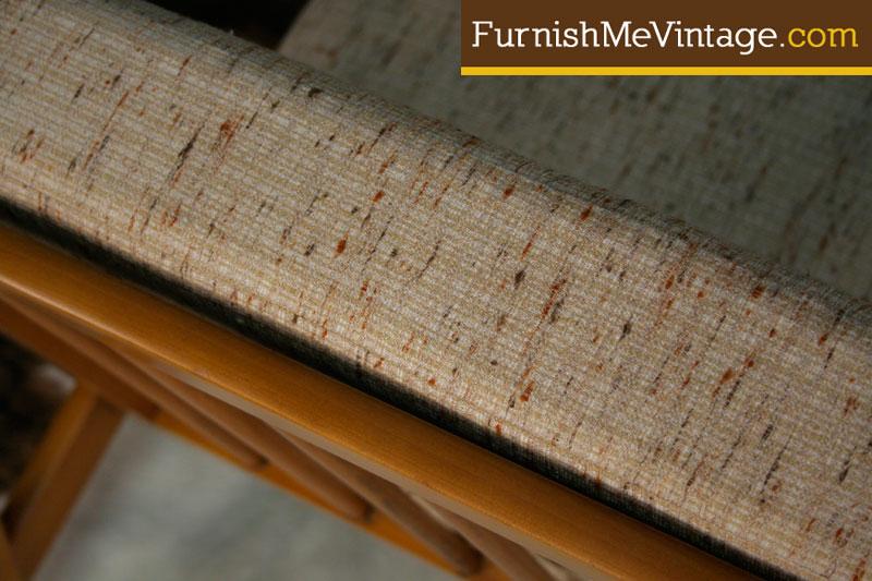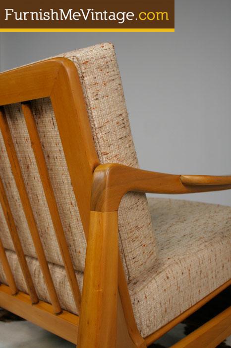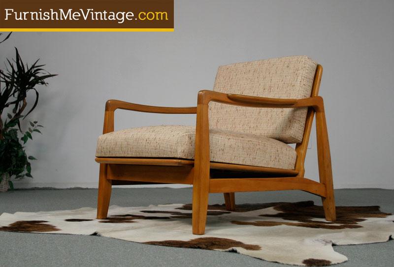 Restored Mid Century Modern Danish style lounge chair. Solid wood frame has been newly refinished. Cushions have new foam. Recovered in NOS (new old stock) fabric. Upholstery is authentic vintage textile — unused old stock. Unmarked, likely American made. Wider and deeper than most similar lounge chairs of the period. A stature more suitable to today’s standard of comfort. Bottom cushion has a spring base built onto a wooden frame. Very unusual construction for this type of chair. An indication of quality.