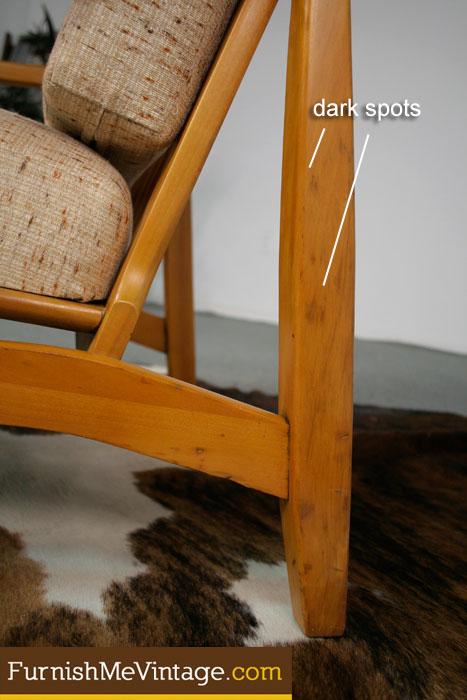 Rehabbed with new cushions, refinished wood frame and new seat foam. Some deep blemishes remain on back of legs (see photos).