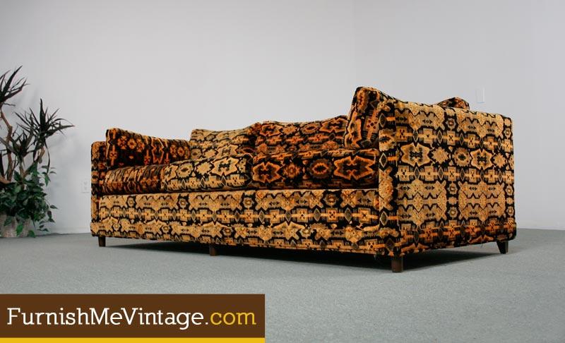 Corduroy velvet retro full size sofa. Vintage 1970s with orange and black super soft fabric. Ultra comfy with lots of pillows and soft foam. Sit down on these couches, and it will hug you. Metal coil spring supports are all tight. No sagging. Time capsule pieces! In amazing, all original condition! Complete your funky far-out living room with our smoked glass coffee table and end tables (sold separately).